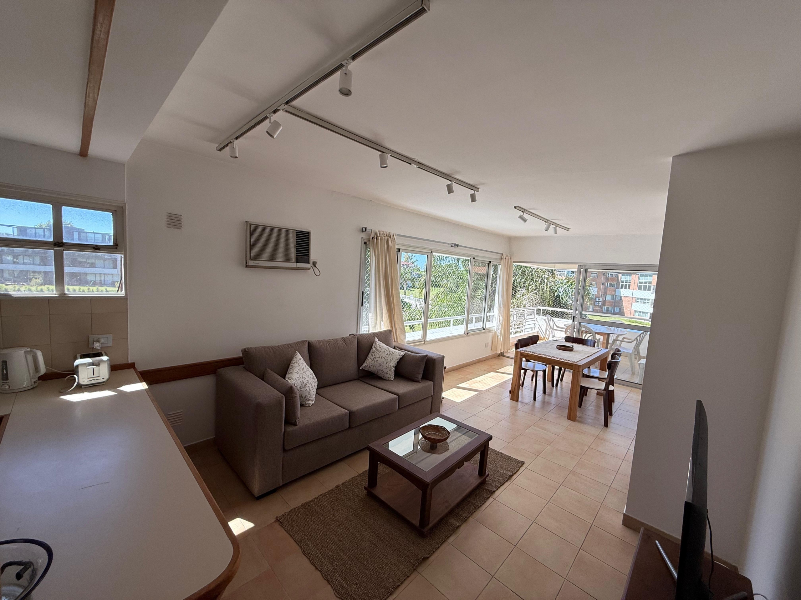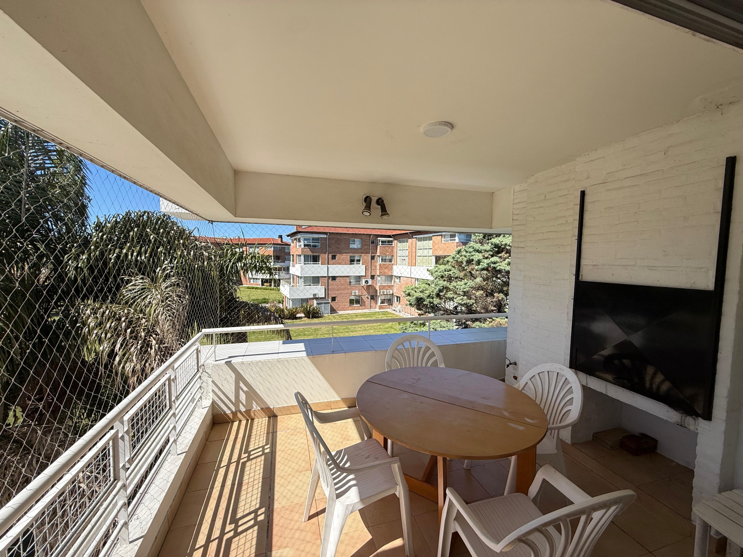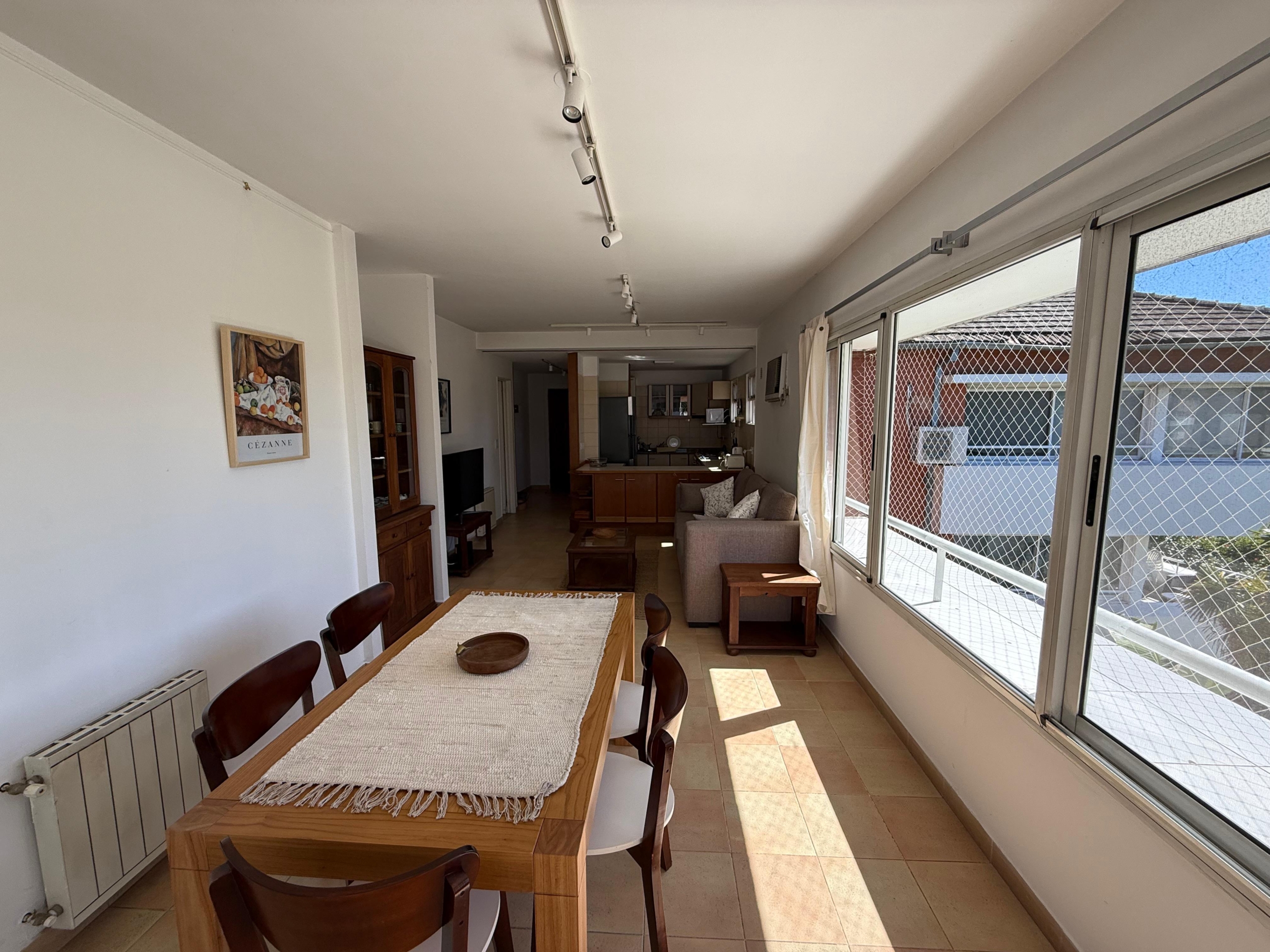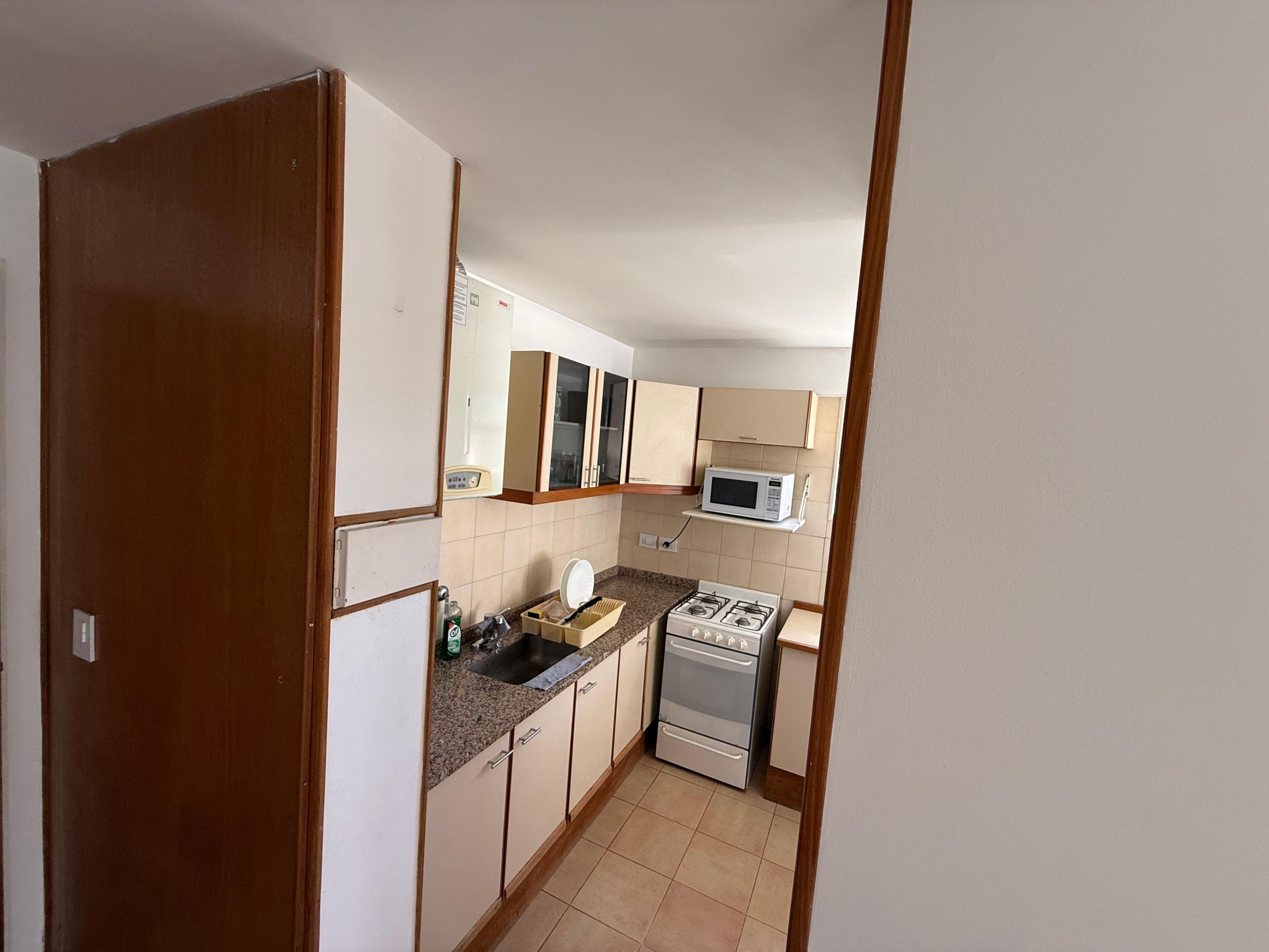Cocina intregrada con desayunador al living, amplio y muy cómodo, con salida al Balcón terraza, con Parrilla y las mejores vistas del complejo hacia los jardines y la pileta.